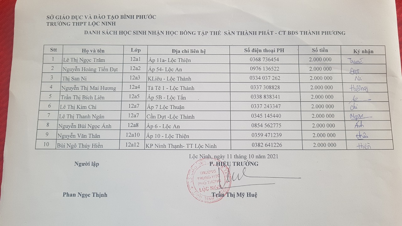 Danh sách HS nhận học bổng - CT BĐS Thành Phương